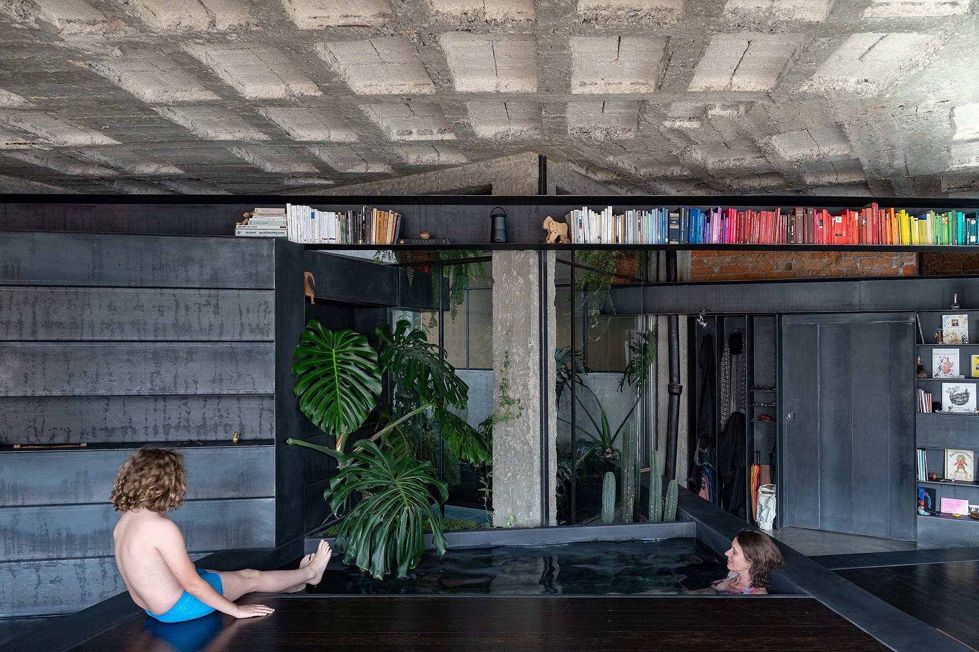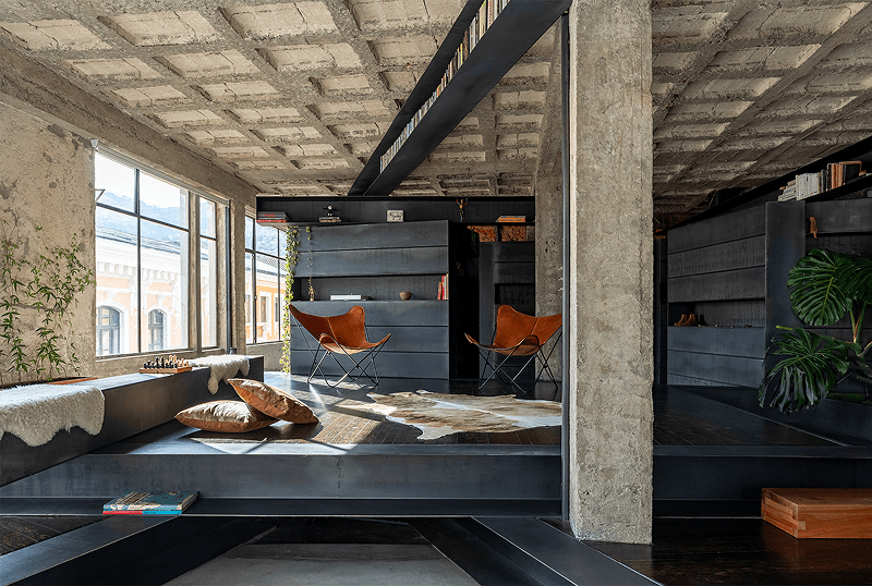 The space is reorganized through a single thin metal element that cuts diagonally across the plan and volume. Repeated in different positions, this folded system operates simultaneously as structure, furniture, storage, platform, and circulation device. Its formal lightness contrasts with its structural resistance, allowing it to articulate levels, organize movement, and define zones without full compartmentalization.