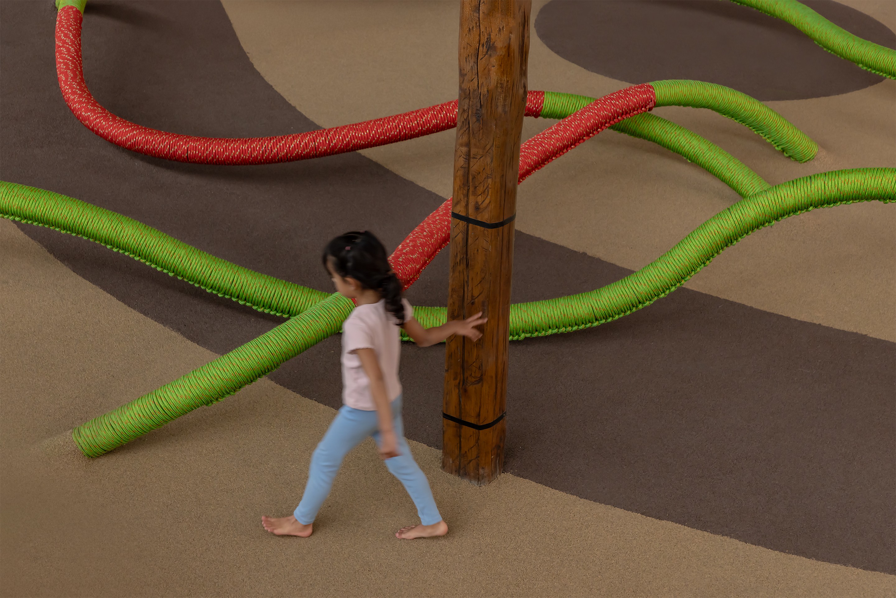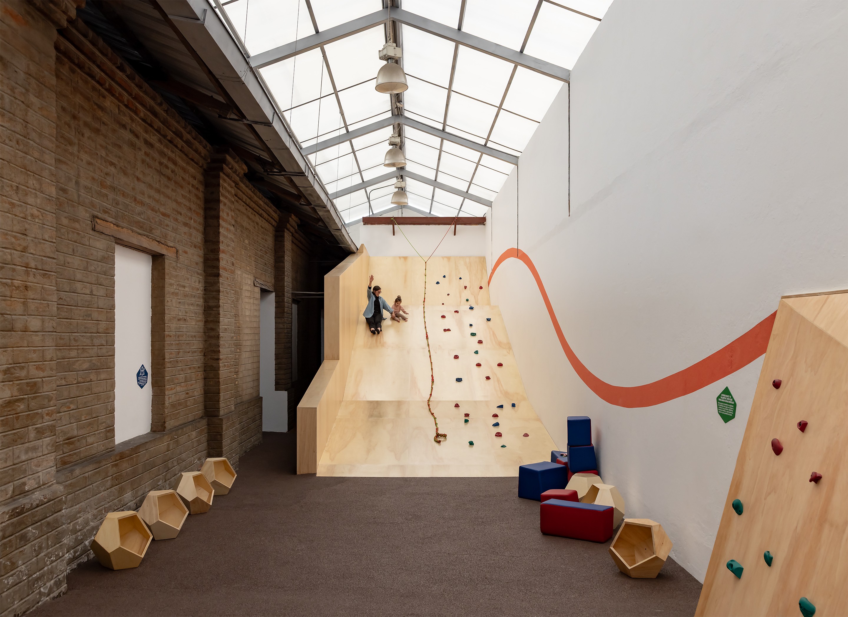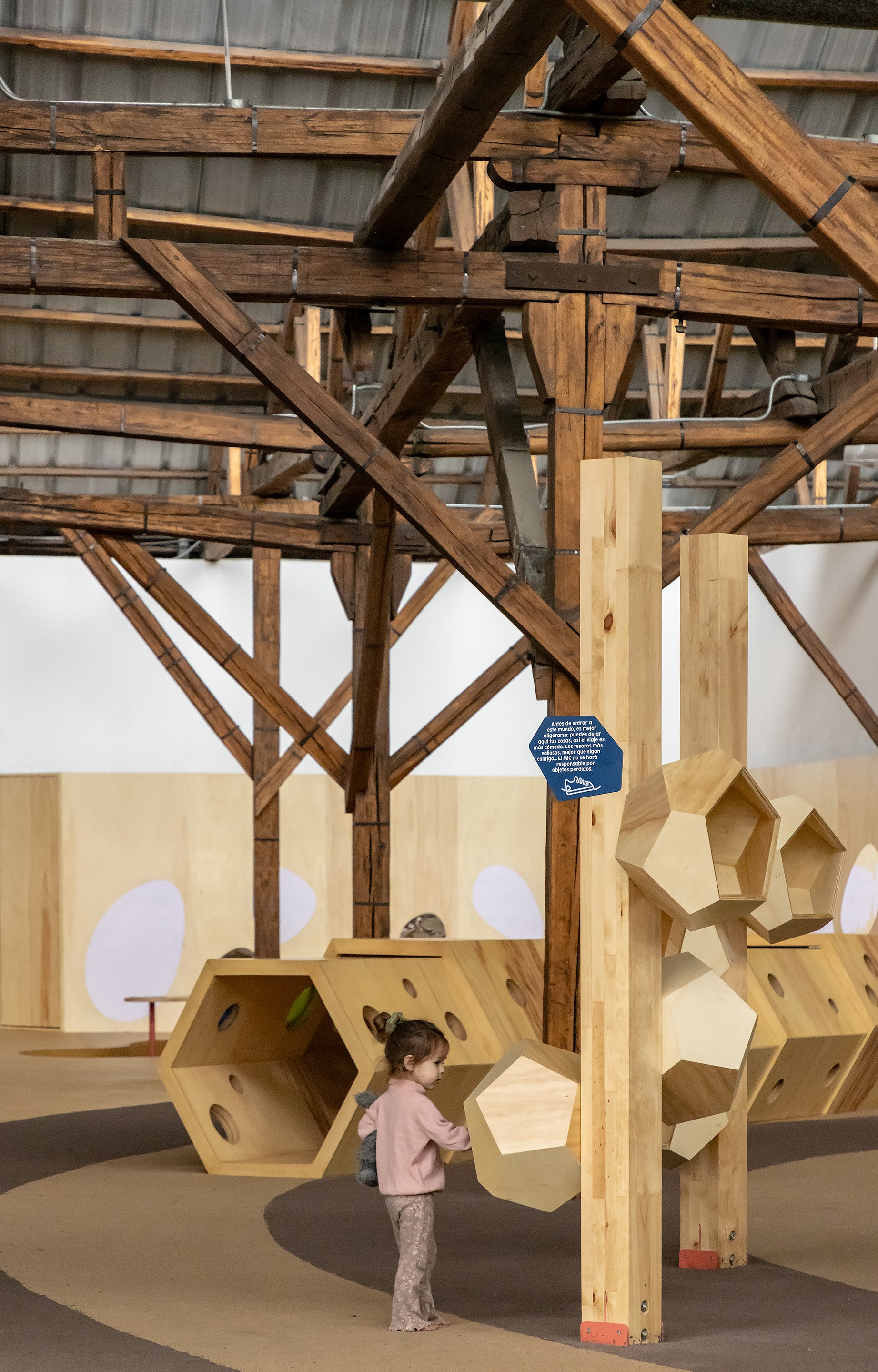The Early Childhood Room at the Interactive Science Museum was conceived as an open ecosystem where architecture, materials, and the body interact without predetermined routes. Designed as a habitable landscape, the space combines wood, textiles, ropes, perforated surfaces, modular volumes, and woven structures to encourage free movement, sensory exploration, and autonomous discovery. Each zone offers different intensities—from climbing, balancing, and navigating soft terrains to moments of pause, observation, and calm—allowing every child to find their own rhythm.