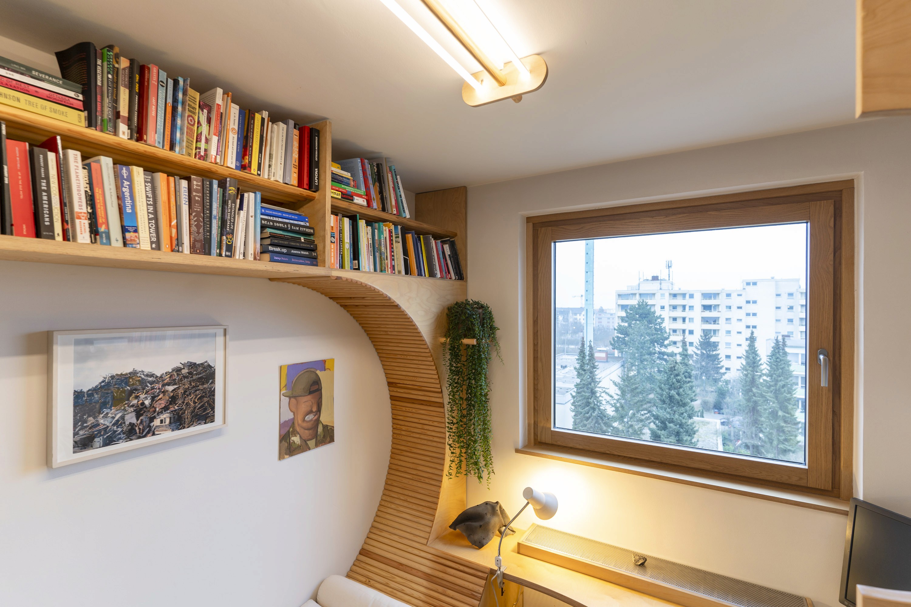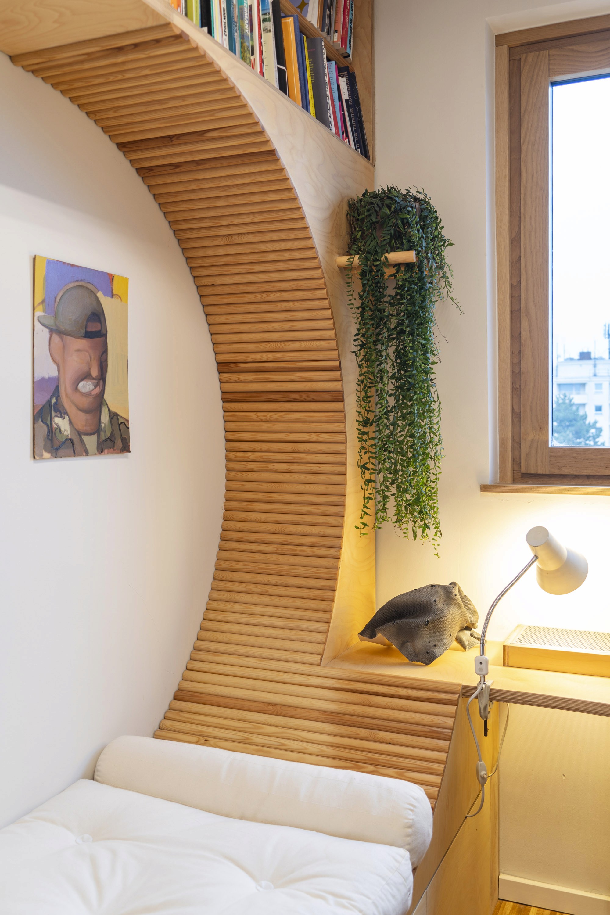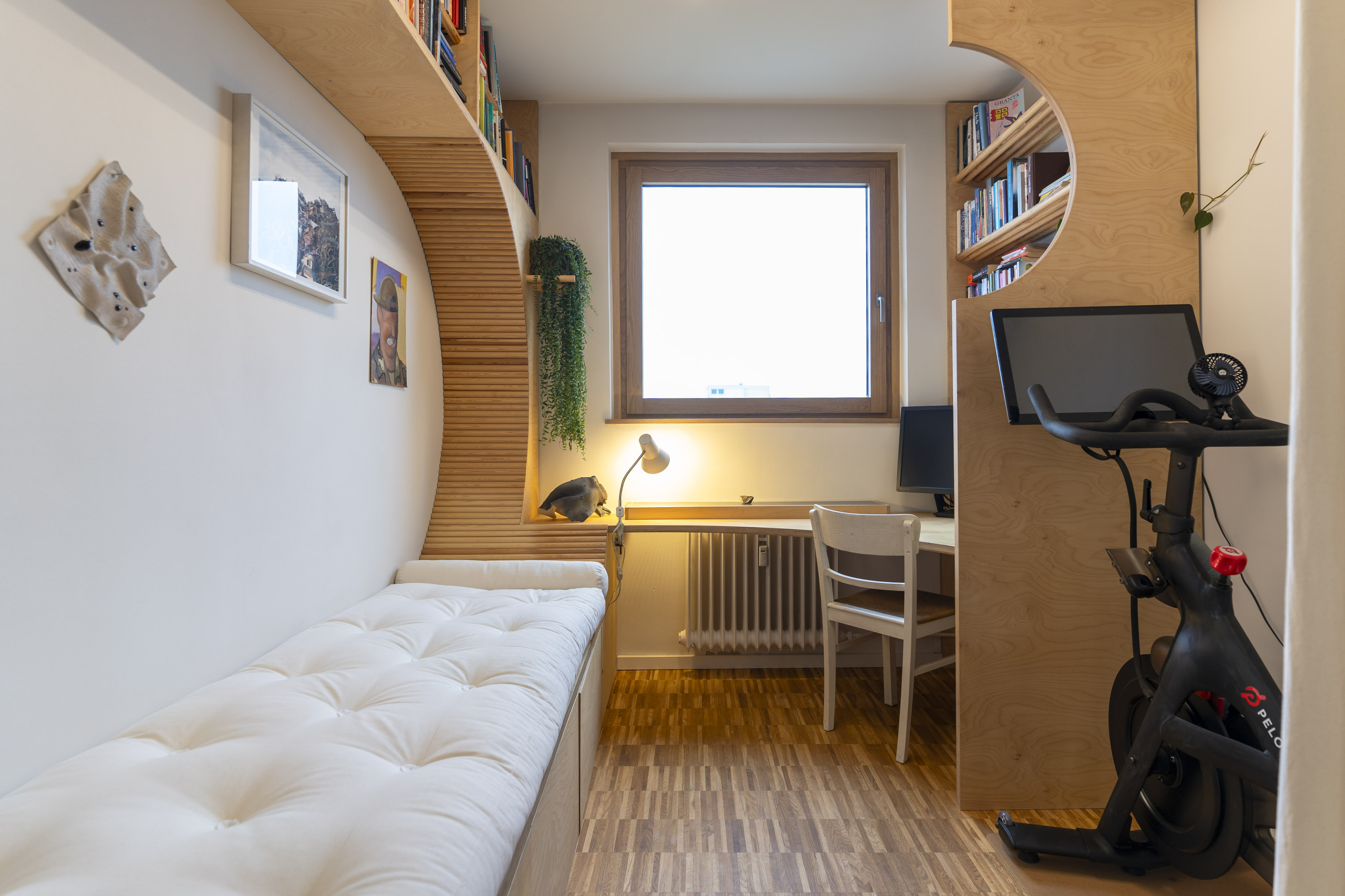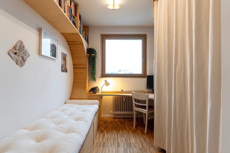 Wood was chosen to unify and soften the environment. Its tone and texture connect the different areas, while the curved panels introduce subtle rhythm and tactile warmth. Curves integrate the furniture—shelves, desk, and bed—into a continuous flow, avoiding fragmentation and creating a sense of openness. The space becomes comfortable for long hours of reading or writing, while remaining visually balanced and inviting.