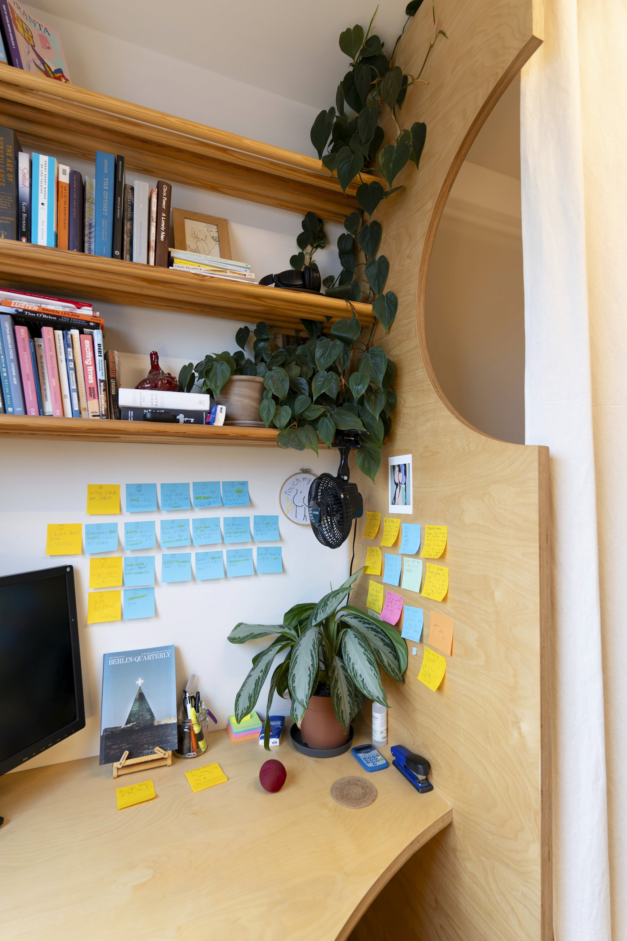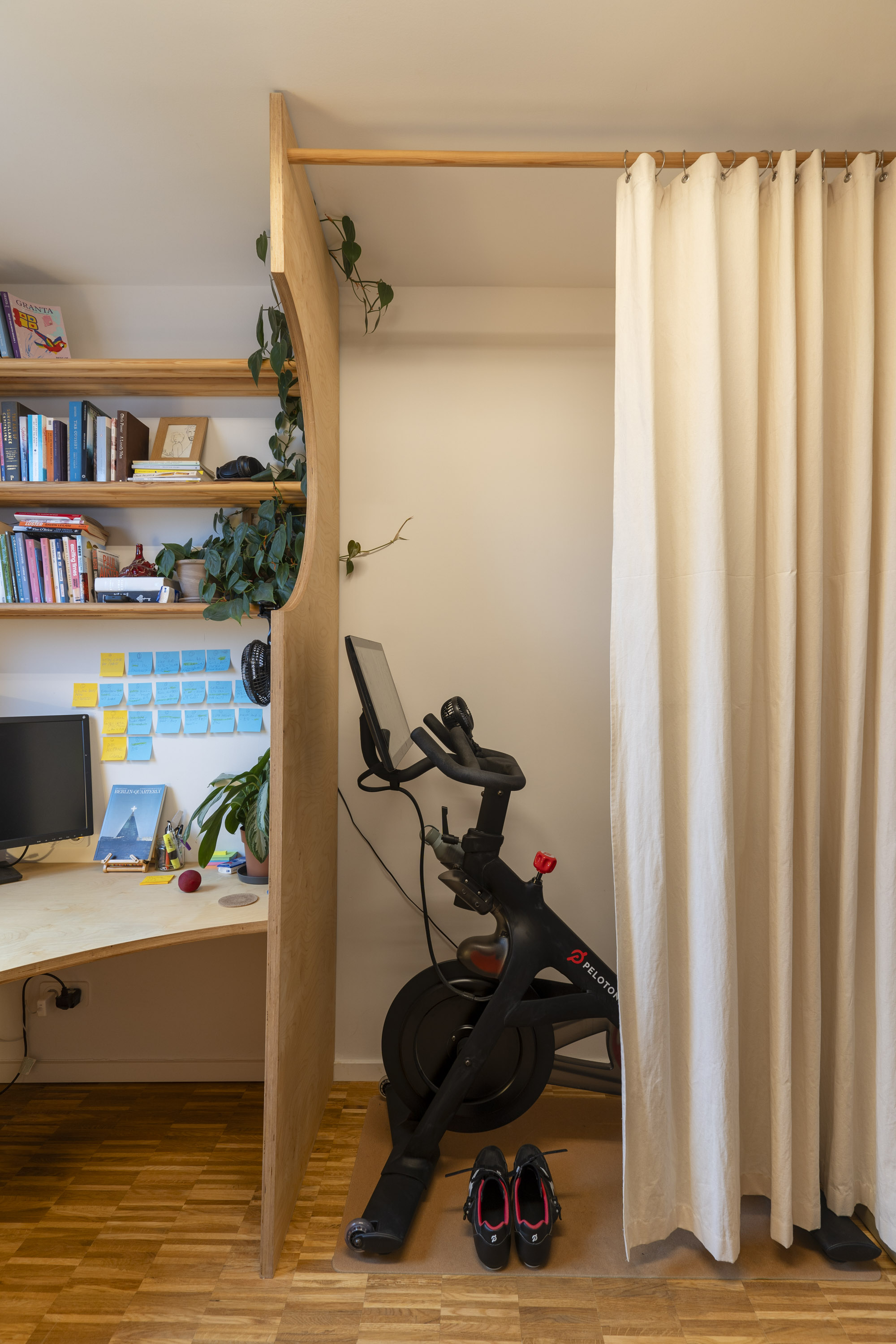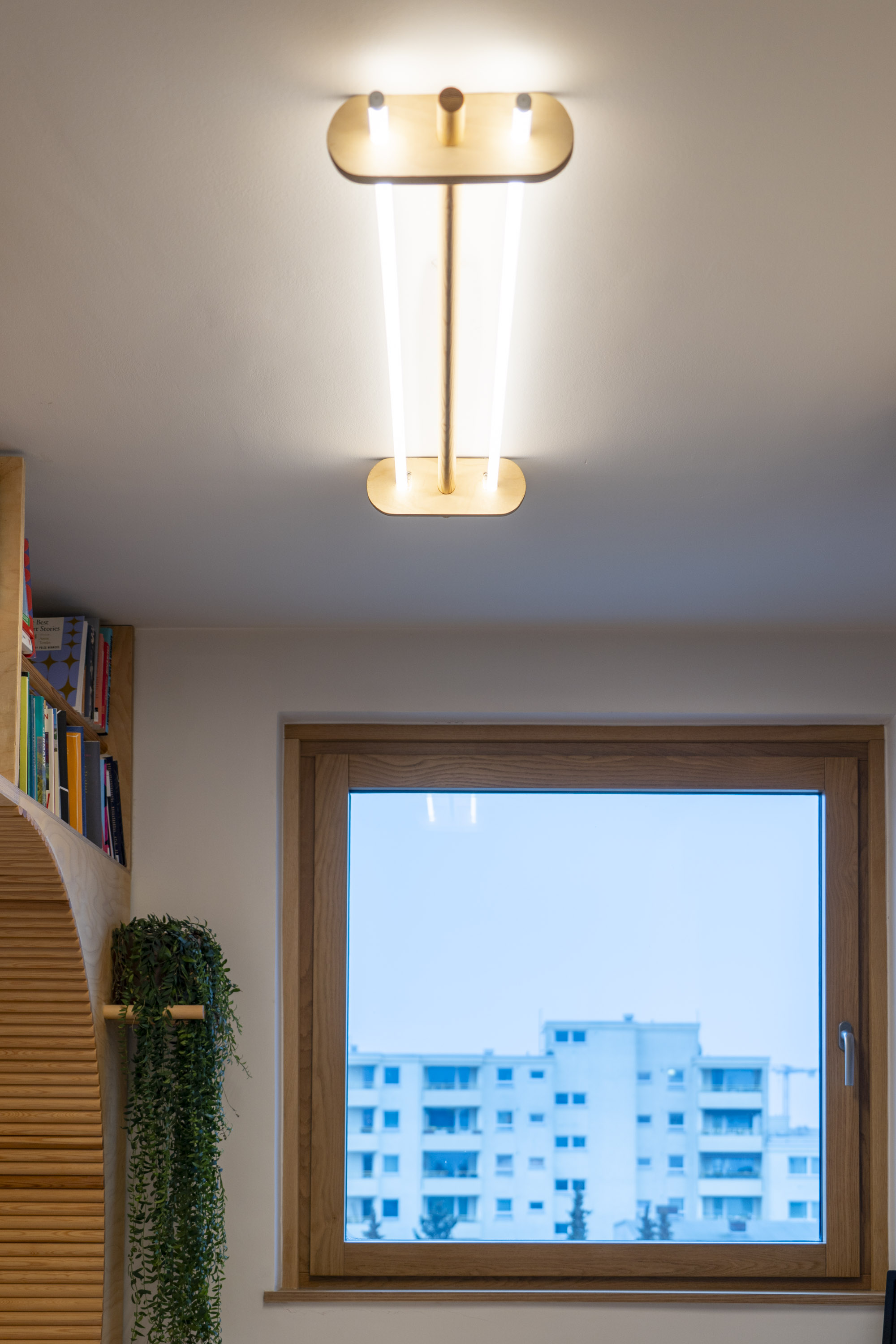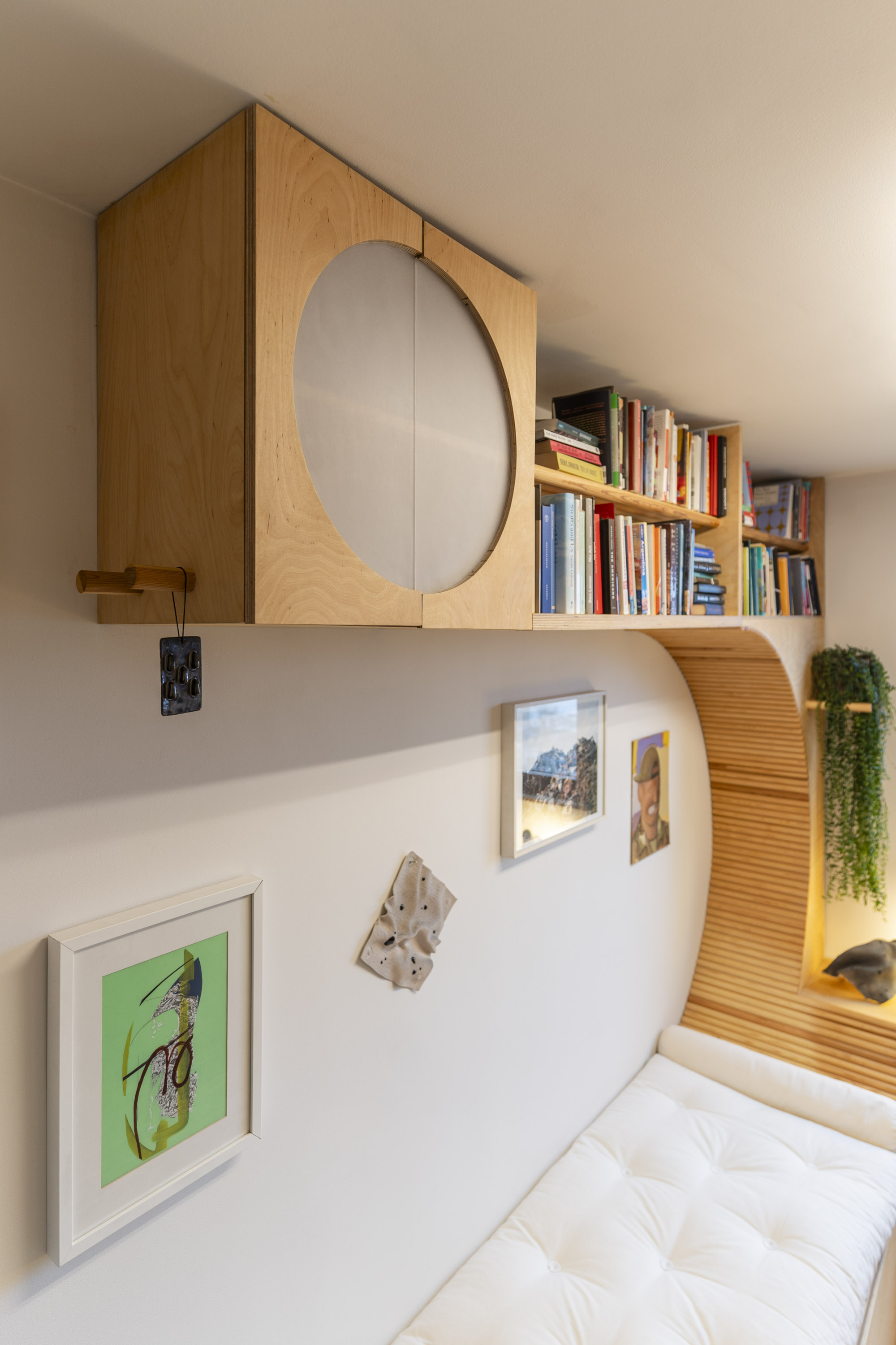 Wood was chosen to unify and soften the environment. Its tone and texture connect the different areas, while the curved panels introduce subtle rhythm and tactile warmth. Curves integrate the furniture—shelves, desk, and bed—into a continuous flow, avoiding fragmentation and creating a sense of openness. The space becomes comfortable for long hours of reading or writing, while remaining visually balanced and inviting.
